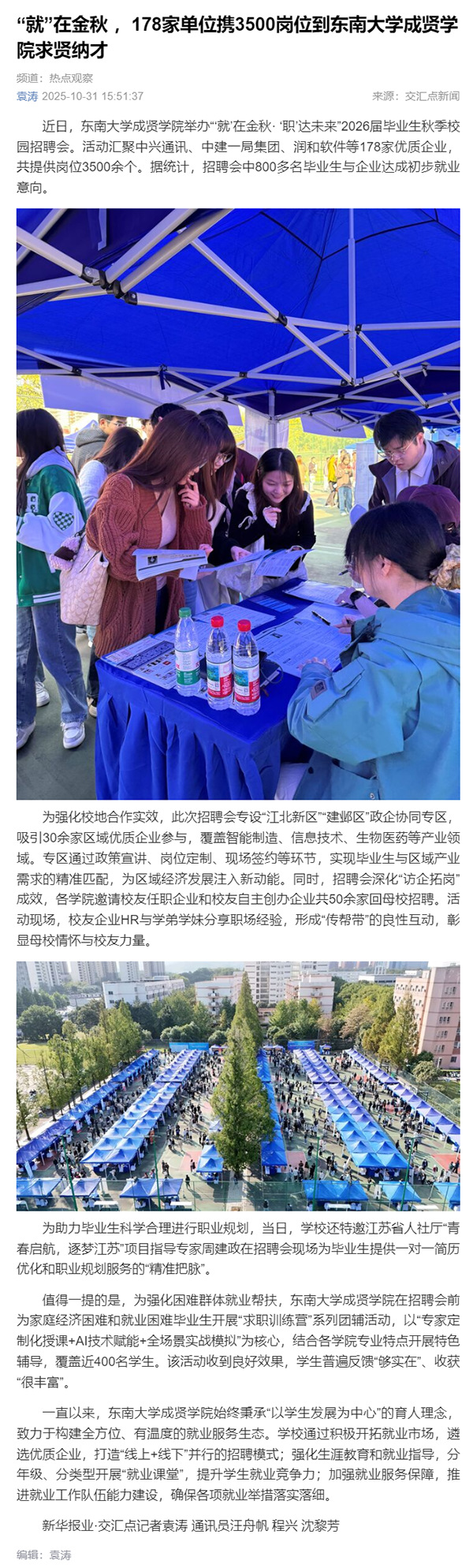 【交汇点新闻】“就”在金秋,178家单位携3500岗位到东南大学成贤学院求贤纳才