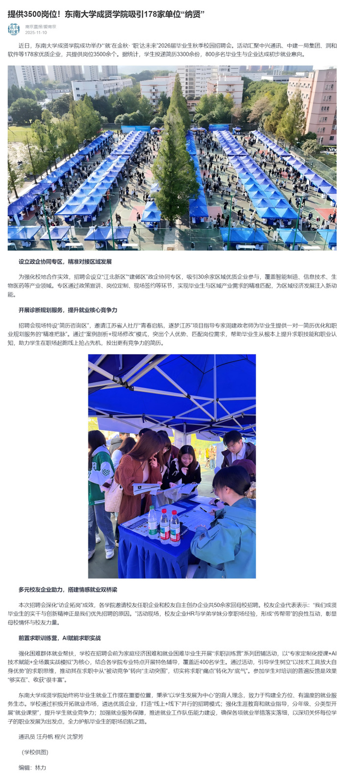 【南京晨报/爱南京】提供3500岗位!东南大学成贤学院吸引178家单位“纳贤”