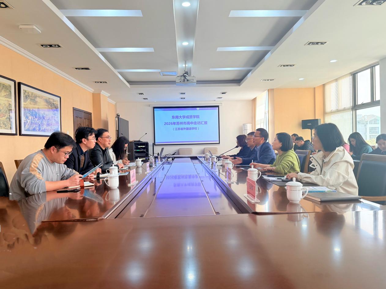 在江苏省外国语学校祁国华等校领导对我校来访表示热烈欢迎,并详细介绍了学校的办学历史、育人理念、课程体系及近年来在教育教学改革方面取得的成效。黄学良常务副院长对中学长期以来为我校输送优质生源表示感谢,介绍了学校依托东南大学办学优势,在应用型人才培养、专业结构优化、产教融合等方面的特色举措。戴玉蓉副院长重点介绍了学校在拔尖人才培育、实践教学平台建设、学生创新能力提升等方面的做法与成效。双方一致表示,将在研学实践、招生宣传等方面加强合作,推动协同育人走深走实。